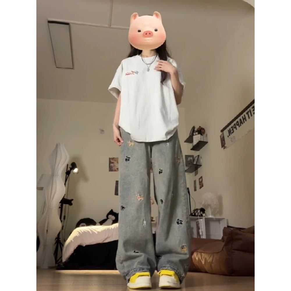 Grey Wide Leg Embroidered Denim Jeans with High Waist for Women - Margherita