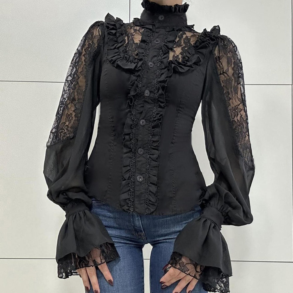 Black Lace Long Sleeve Button Blouse with Ruffles for Women - Olimpia