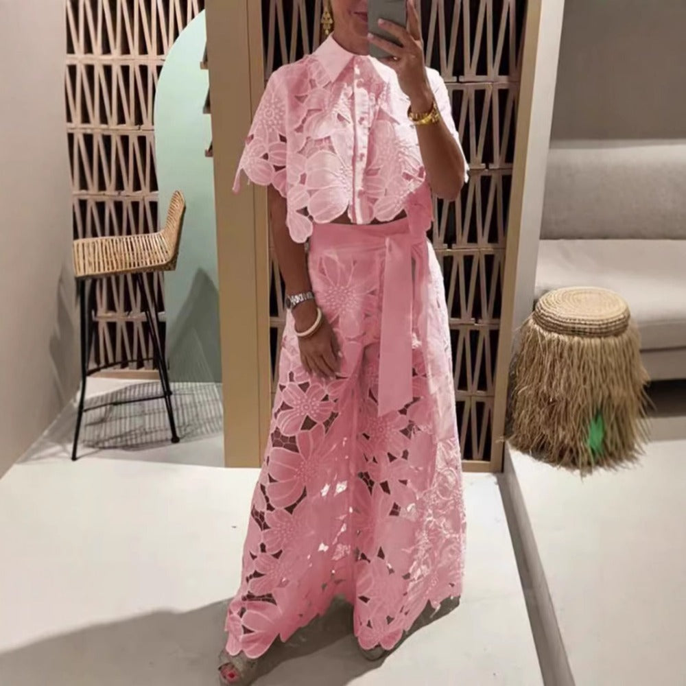 Lace Short Sleeve Top and Wide Leg Pants Set for Women - Virginia