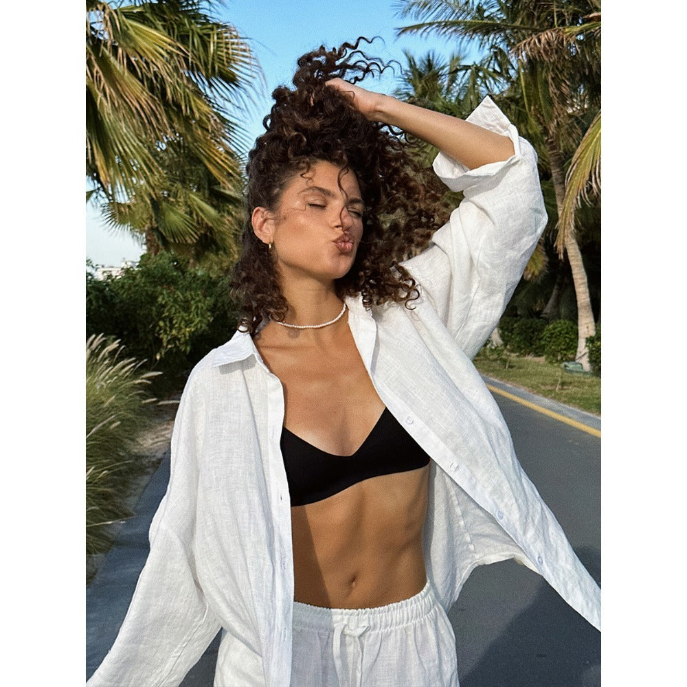 This white linen shirt and pants set offers a perfect combination of comfort and style, designed for warm weather. With its lightweight fabric and relaxed fit, this set is perfect for creating a laid-back yet chic look.